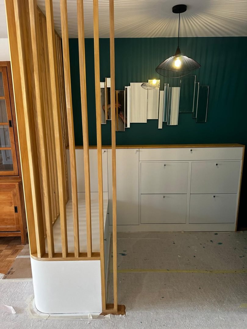 Le projet comprenait la conception et la fabrication de meubles et de claustras sur mesure, parfaitement intégrés à l’espace existant. Ces éléments d’agencement ont permis d’optimiser les volumes, de structurer les circulations et d’apporter une solution à la fois esthétique et fonctionnelle, en cohérence avec les usages du logement.